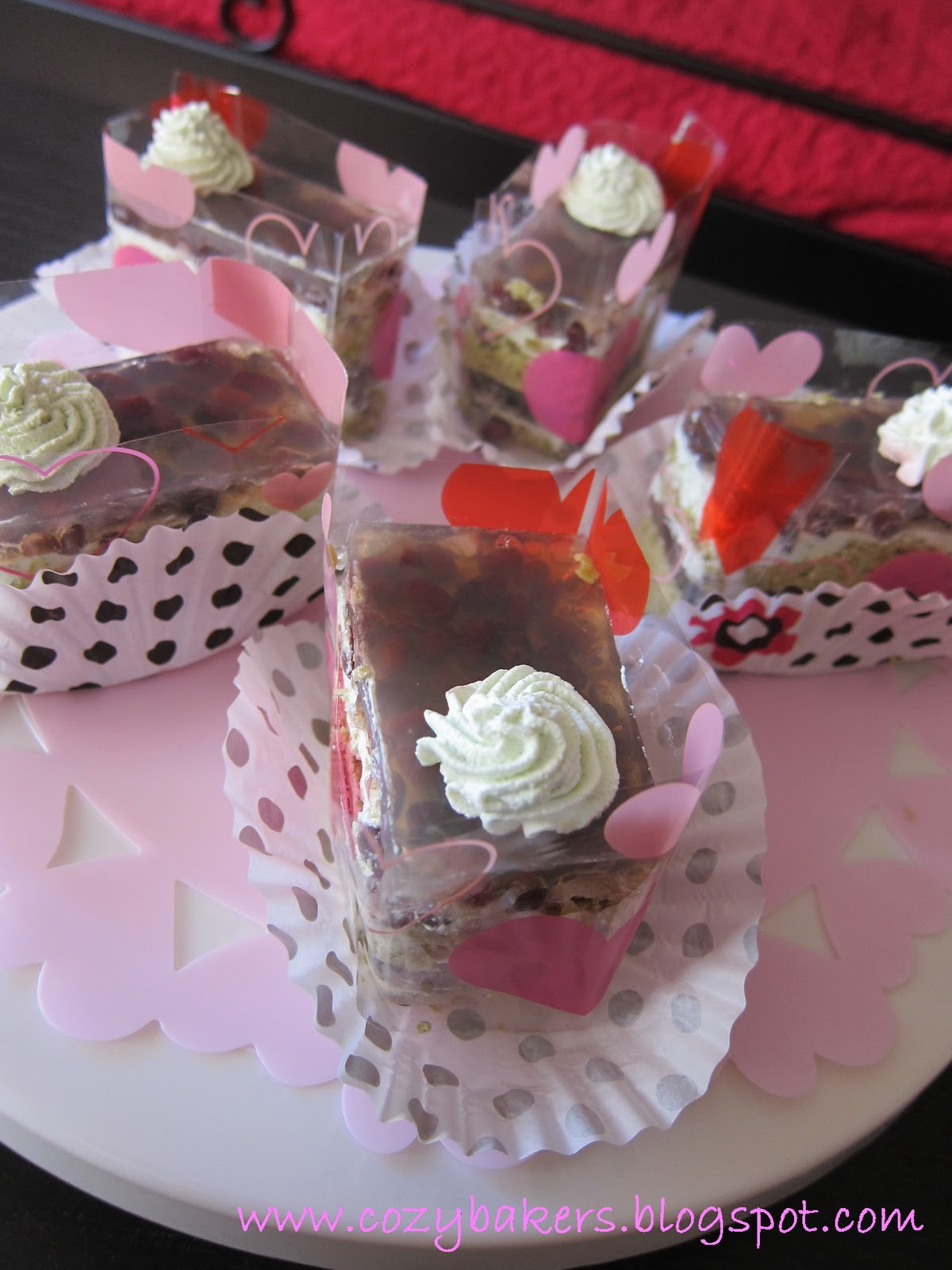 I made a square cake and cut into individual portion. I use a Polka Dots Paper Baking Cups as the base |
